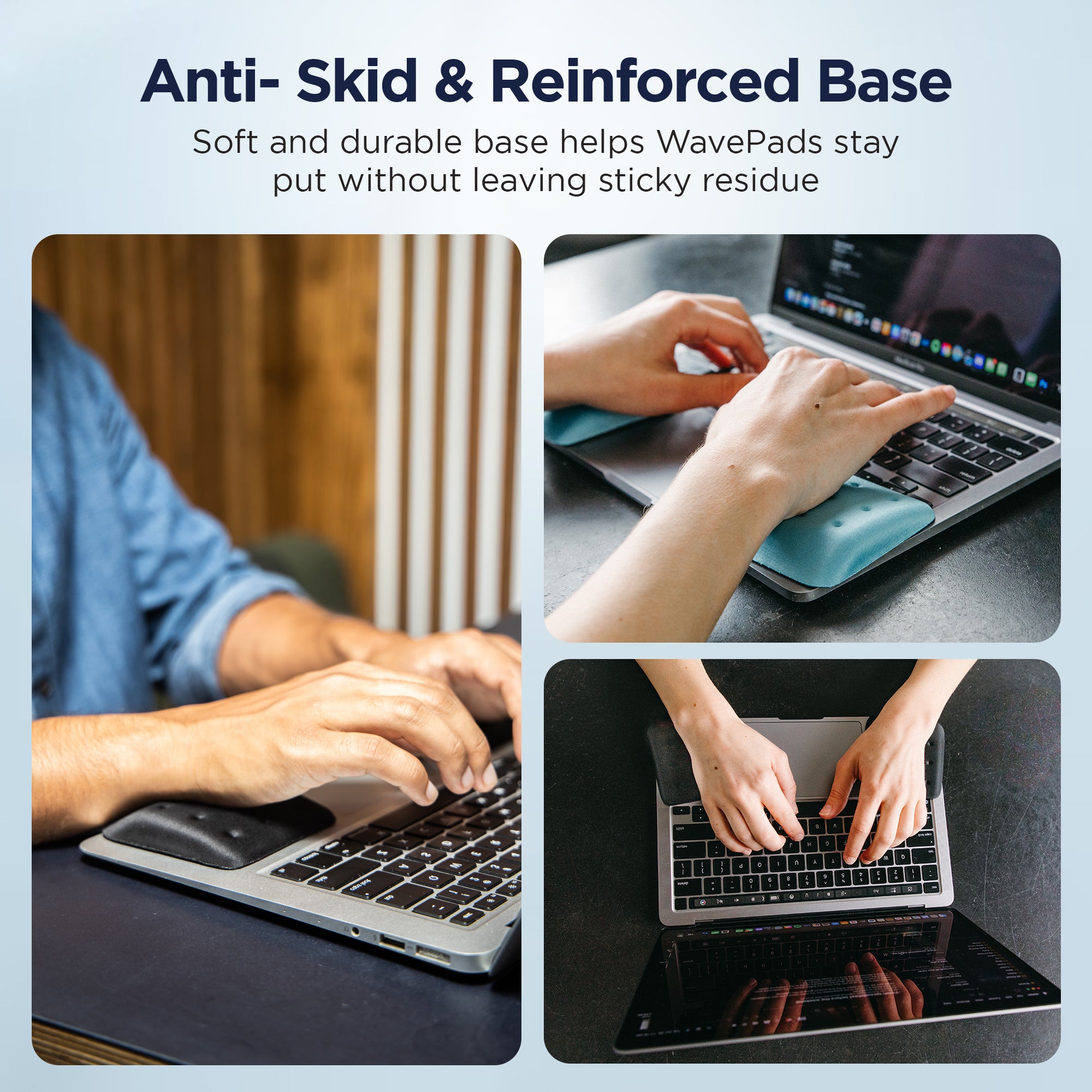 The WavePads were designed to prevent long-term pain caused by typing. Their ergonomic design provides long-term support and comfort to those who suffer from wrist pain from prolonged typing.